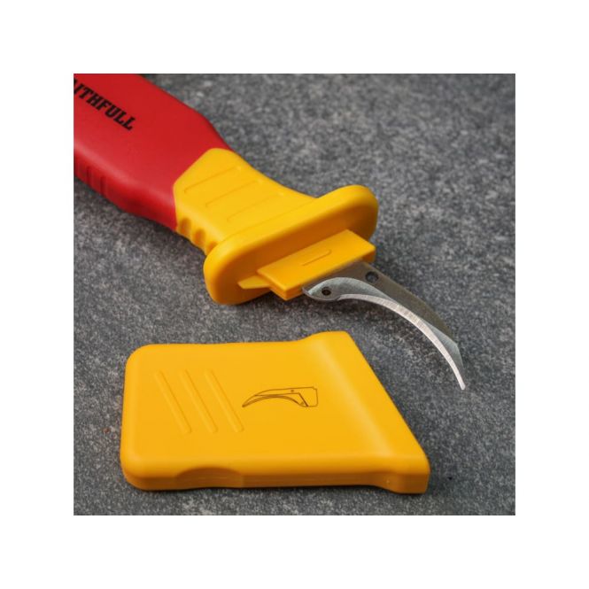 Faithfull VDE Stripping Knife is a specialised tool designed for precision and safety in electrical work. This knife is perfect for stripping insulation from cables and wires, ensuring clean and accurate cuts every time. The curved shape of the sickle blade helps give a clean and controlled cut around the insulation without damaging the wires on the inside.