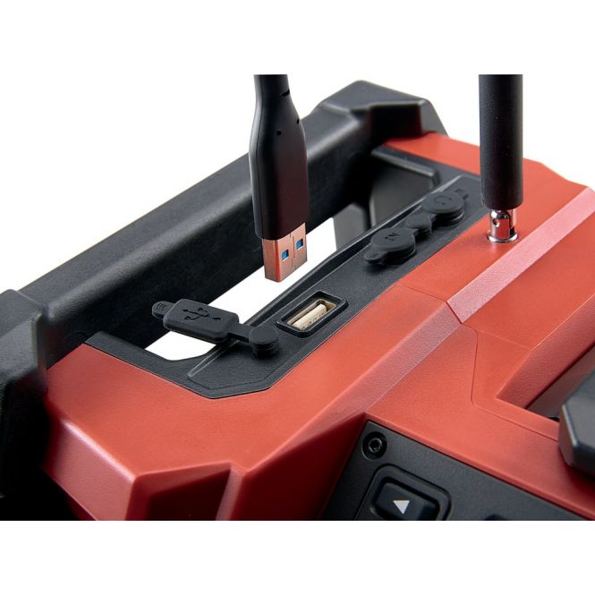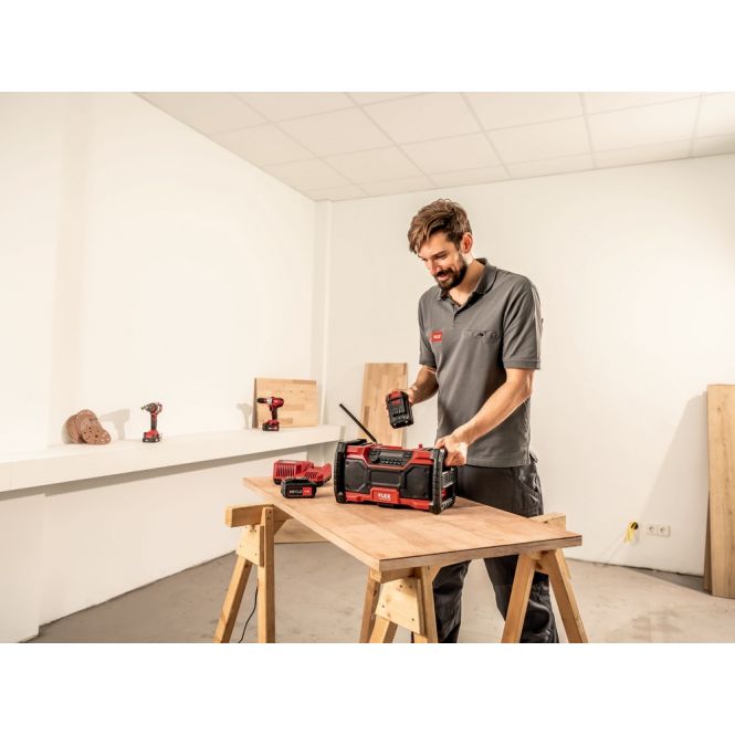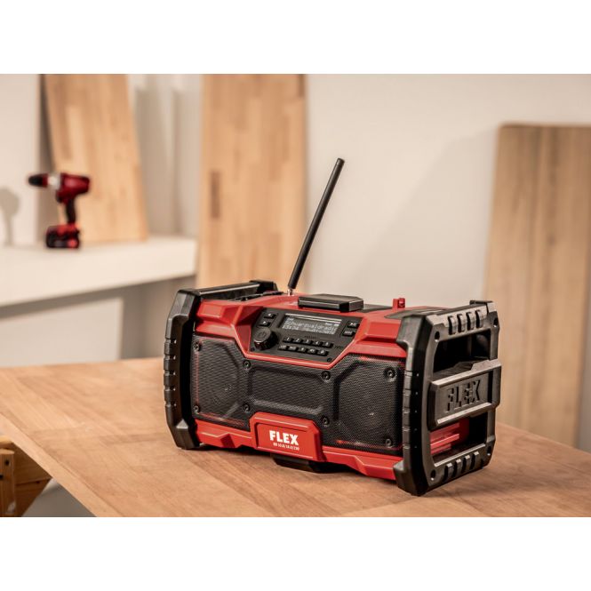 The Flex Power Tools RD 10.8/18.0/230 Cordless Radio has a robust construction and can be powered by mains or by Flex 10.8-18V Li-ion batteries. It is capable of receiving DAB+ and FM stations. With automatic station search and 5 memory spaces. Integrated Bluetooth® technology means you can connect your favourite device, ideal for streaming music. It also features an AUX input and a USB port/charger so you can connect/charge smartphones, tablets etc.