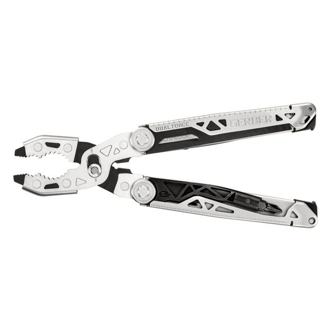 The Gerber Dual Force Multi Tool has a layered construction to provide 3x the jaw strength and 2x the force to manhandle any task put in front of it. It features 13 tools: small fastener pliers, regular pliers, adjustable, two-size slip joint jaw, wire cutter, wire stripper, 3.25in plain edge blade, 3.35in center-drive axis tech, saw, fine/coarse file, chisel edge, #1 and #2 cross drive, medium flathead driver, 8in/20cm ruler and lanyard hole.