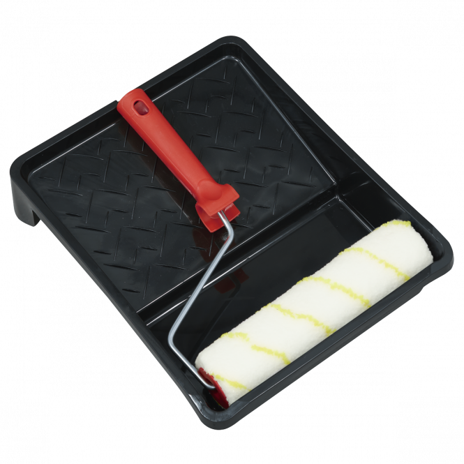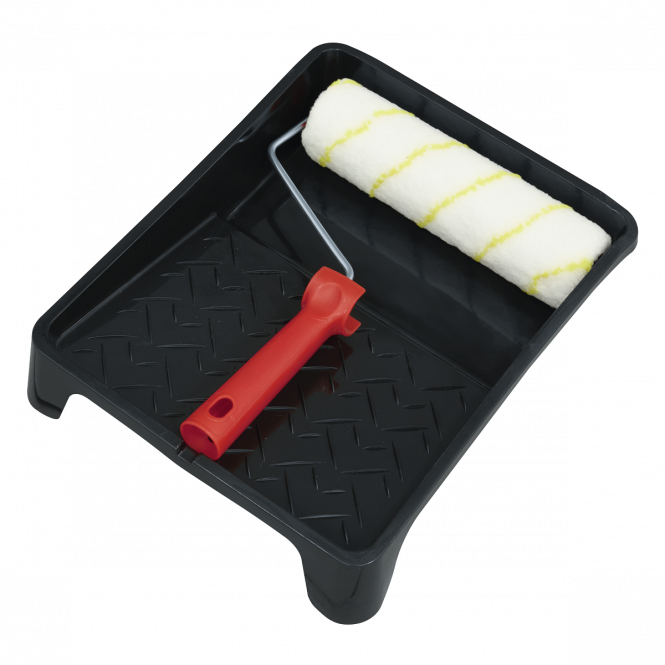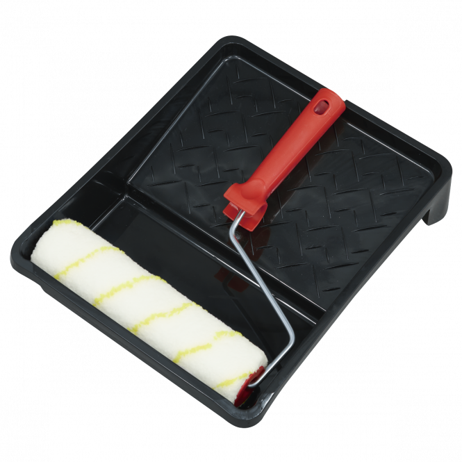 9" Roller is the perfect size for painting large spaces at a time. Paint tray can hold large volumes of paint with application area to cover roller. Roller allows paint to be applied in a smooth, consistent layer. Groove in tray allows you to rest the roller in the tray without it getting paint on the handle.