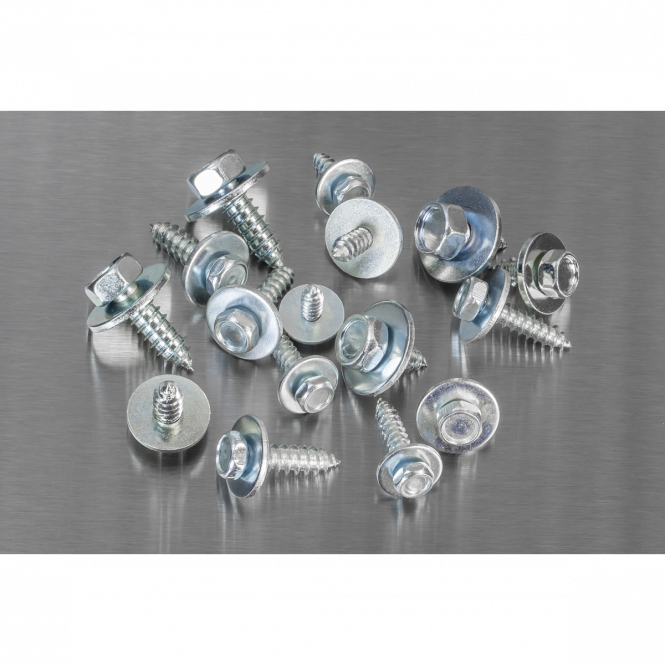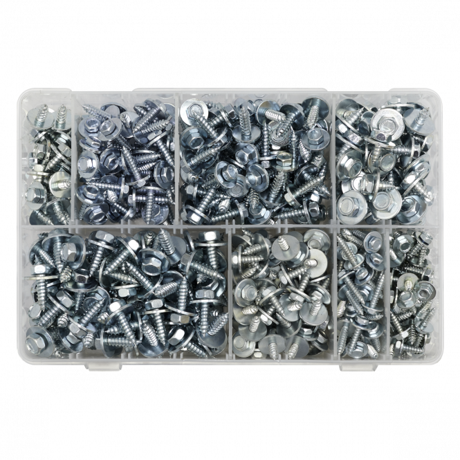 Sheet metal screw (Acme bolt) assortment. Captive washer. BS 7976/6903. Contents (Approximate Quantity): M8 x 1/2" (x50), M8 x 3/4" (x50), M10 x 1/2" (x50), M10 x 3/4" (x50), M12 x 1/2" (x25), M12 x 3/4" (x75), M14 x 1/2" (x50), M14 x 3/4" (x75). Supplied in a partitioned box.