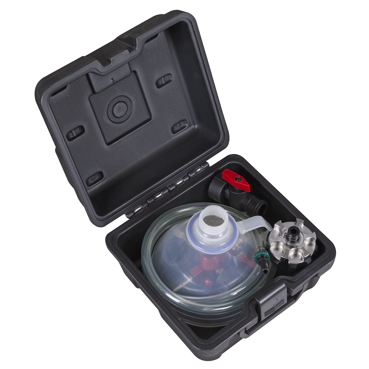 Eliminates the introduction of bubbles and airlocks into the cooling system and dramatically reduces system filling time. No more time-consuming cooling system bleeding and messy spills to clean up. Automatically conducts system leak test. Simple operation requires a workshop air supply and does not require a fiddly interchange of vacuum and fluid hoses. Refill the system by attaching the filler hose and opening the valve allowing your premixed coolant to flow into the system. The system can be filled manually via the funnel, which has a built-in shut-off valve that helps prevent airlocks. Supplied with a 1.25m filler hose, six reservoir adaptors 31, 35, 40, 42, 45mm, a cone adaptor and a storage case.