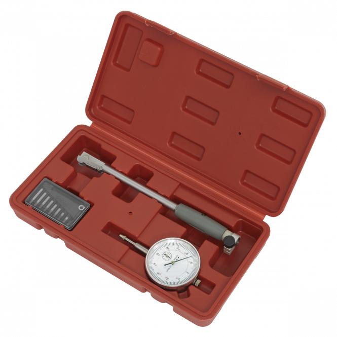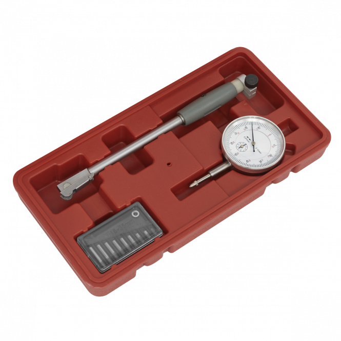 Precision mechanism with Ø58mm dial and locking rotating bezel, offering an accurate method of measuring a bore or detecting a taper or ovality. Will indicate the deviation from set size by up to 10mm with an accuracy of 0.01mm. Probe body, dial indicator, anvils and spacer rings are also included. Supplied in storage case.