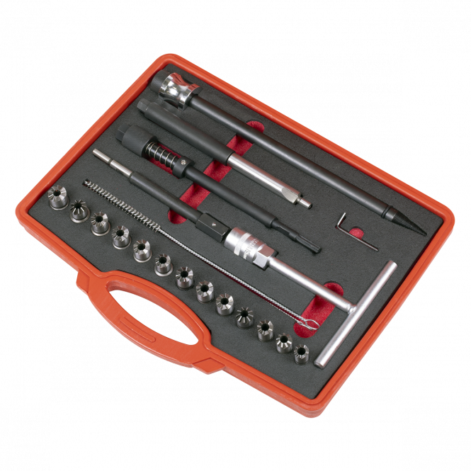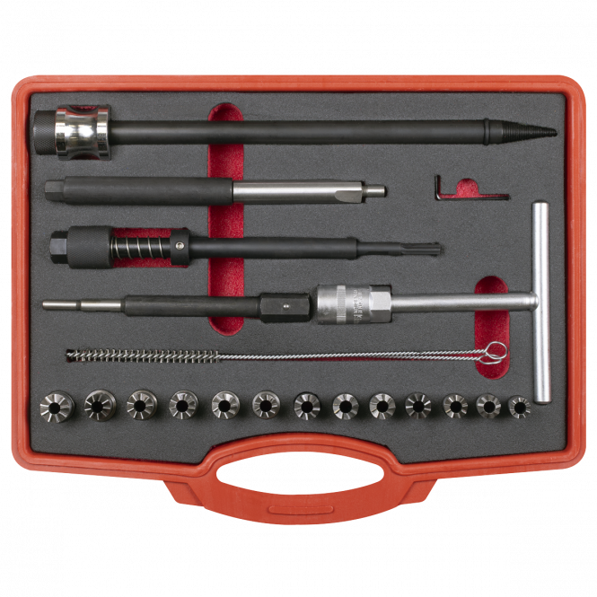 Comprehensive 21pc kit that fits most injector apertures. Used to clean/decarbonise injector seats when changing injectors. It helps to avoid blow-back due to poorly seated injectors. Suitable for a wide range of vehicles. Contents: Reamers: Flat Reamers; 14 x 14, 15.5 x 15.5, 15 x 19, 17 x 17, 17 x 17.5, 17 x 19, 17 x 19.5, 17 x 20, 19 x 21.5mm, Angled Reamers; 15.5 x 15.5, 17 x 17, 17 x 21, 17.5 x 20.5mm, 350mm Injector Seal Puller, T-Handle, Centring Post, Cutter, Guide Pin, 2.5mm Hex Key, Cleaning Brushes (x2).