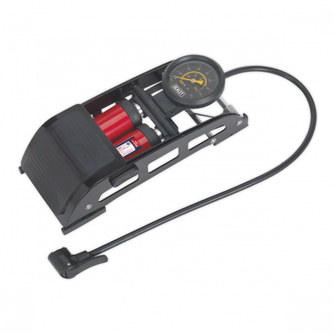 High power, steel framed foot pump with two Ø45 x 115mm steel barrels. Dial type pressure gauge calibrated in psi and bar and ranges from 0-160psi and 0-10bar. Fitted with 700mm flexible pressure hose with locking connector.
