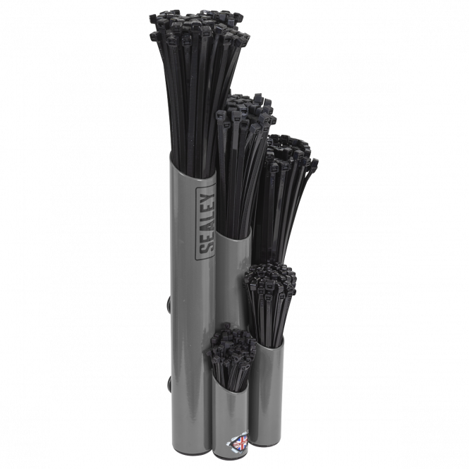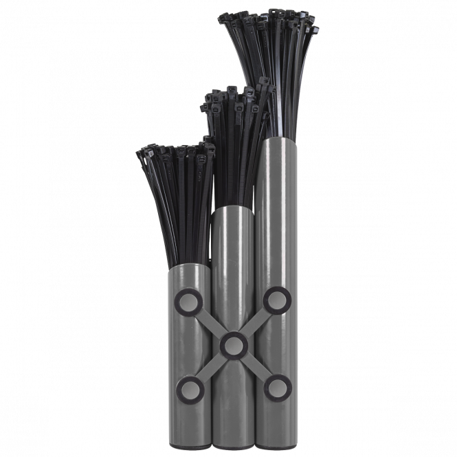 Steel cable tie holder. Attaches to any ferrous surface. With five compartments for varying lengths of cable ties. Five magnetic fixings with rubber pads to prevent slipping. Industrial powder coated finish.
