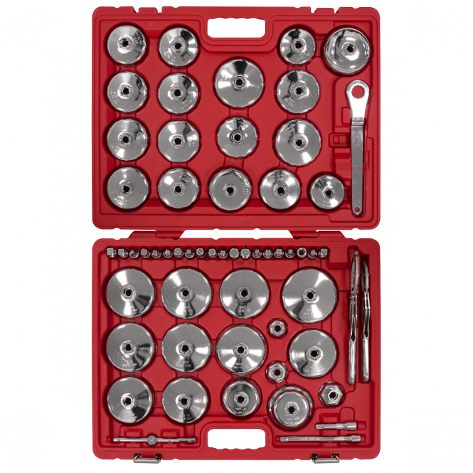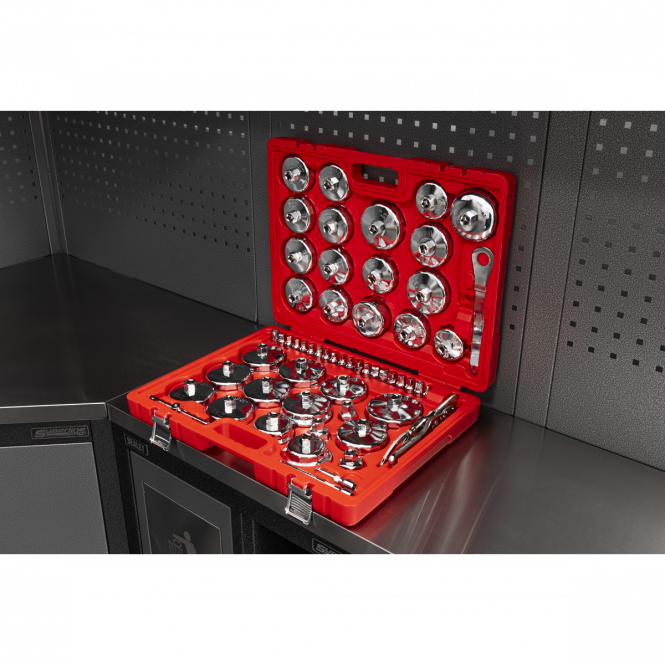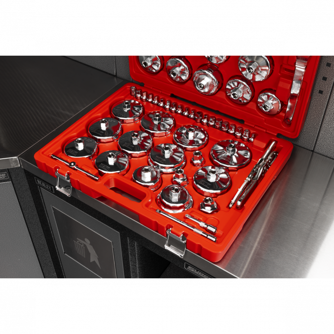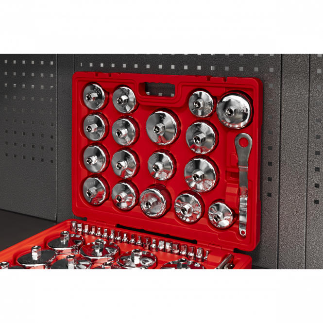 Master oil filter set designed for the removal and installation of oil filters. The 6-point crowned tops provide extra leverage points for removing stubborn oil filter housing caps. Manufactured from high-quality steel, Chrome Vanadium, and stainless steel. A comprehensive set that covers a wide range of applications, with 32 cap wrenches from 27mm to 101mm. Supplied in a storage case.