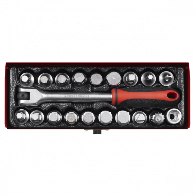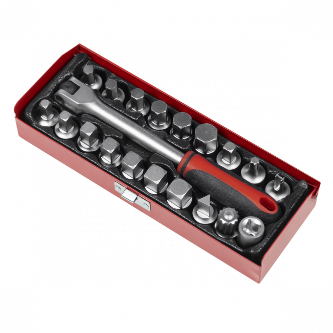 Manufactured from Chrome Vanadium steel for strength and durability. Wrench features a rubber handle for comfort and control. Suitable for modern vehicles with a couple of specialised VAG sockets for specific use. Set is contained in a metal case to protect contents.