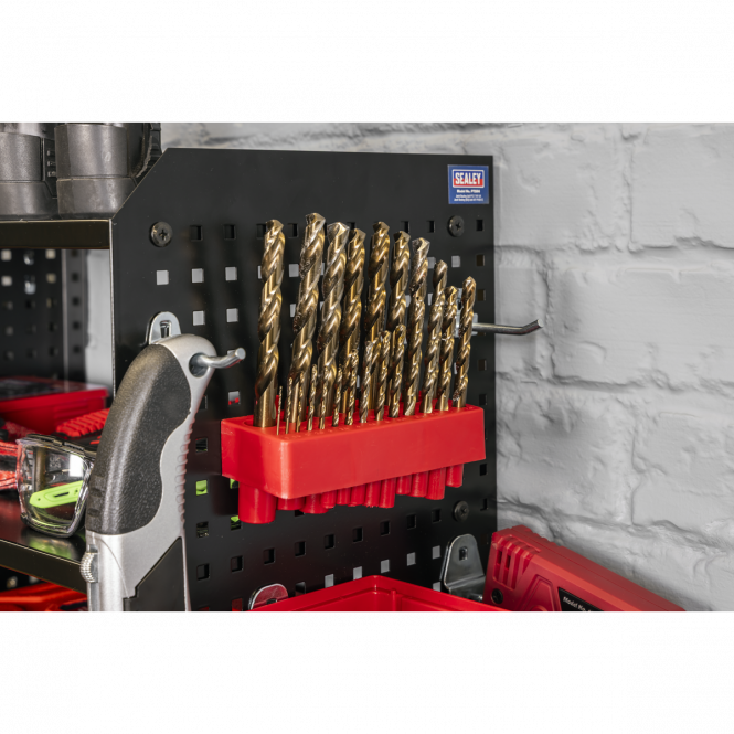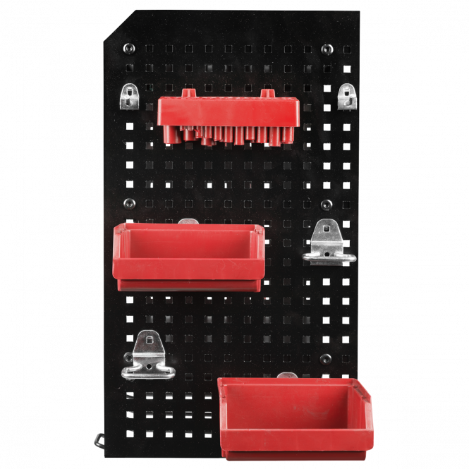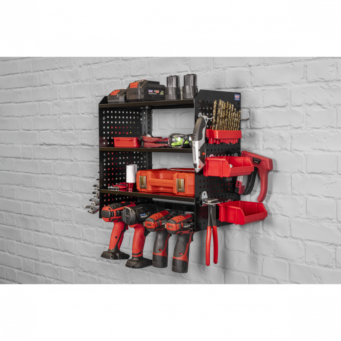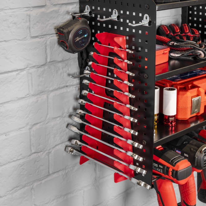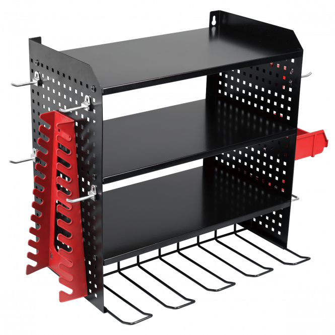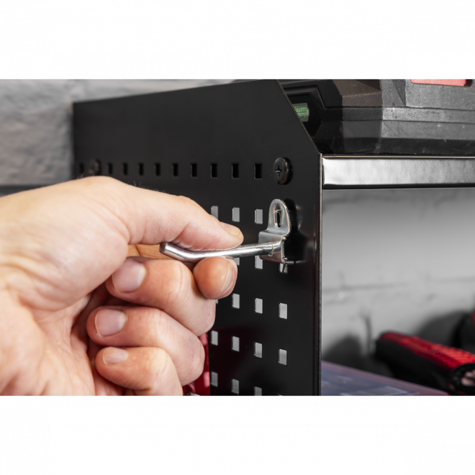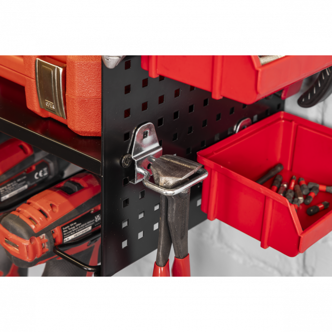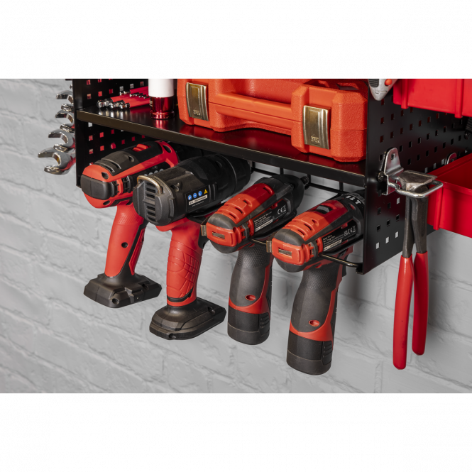 Heavy-duty powder-coated steel construction for strength and corrosion resistance. Holds up to four power tools with easy front-loading access. Three upper shelves for storing batteries, chargers, and accessories. Wall-mountable with pre-drilled holes. Accessories Included: Spanner Rack, Parts Storage Containers (x2), Drill Bit Holder, Tool Hooks (x8). Supplied flat-packed.