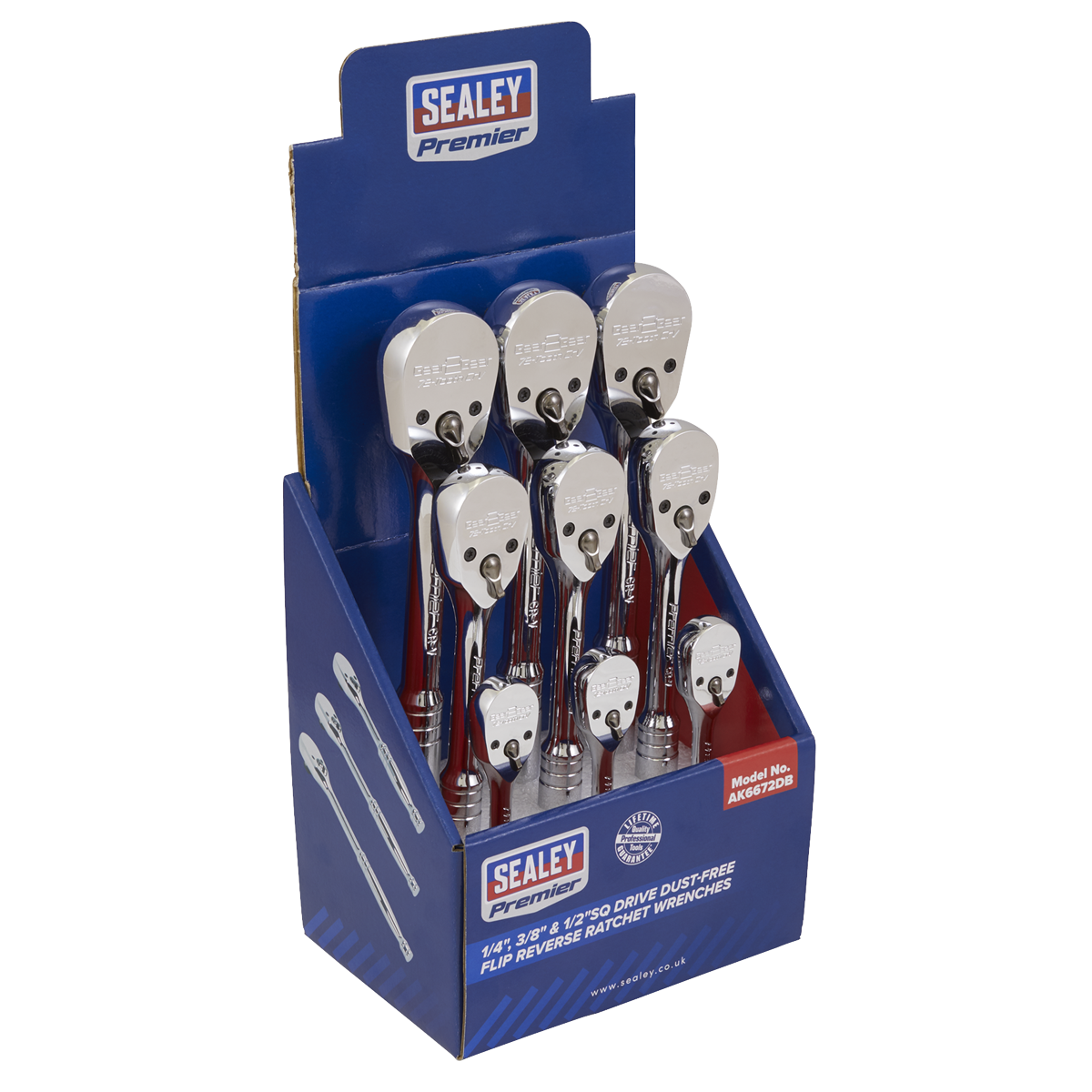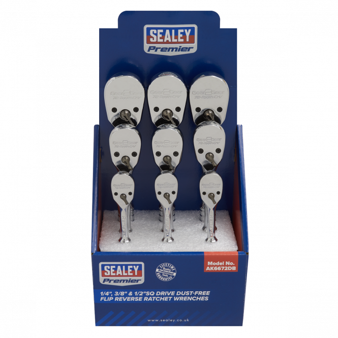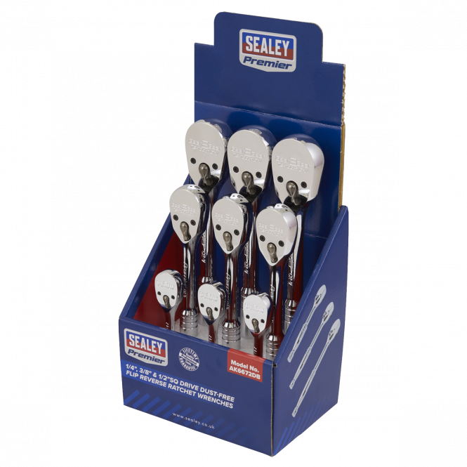 Sealey ToolsRatchet Wrenches 1/4", 3/8" & 1/2"Sq Drive Pear-Head Flip Reverse Display Box of 9 AK6672DB