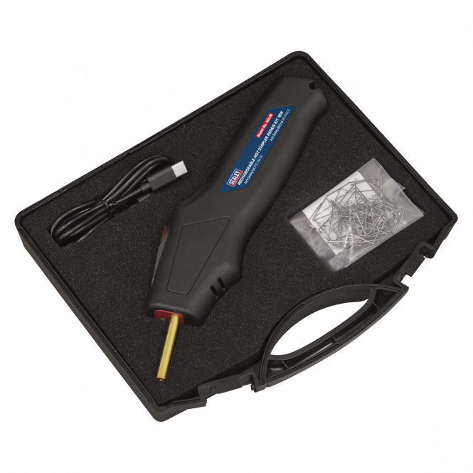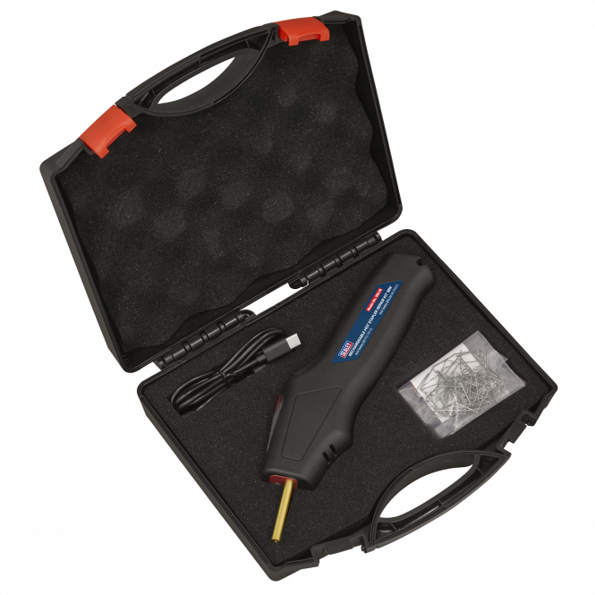 Lightweight and cordless rechargeable welding iron. Inbuilt LED to illuminate welding area in low light areas such as engine bays. Plastic carry case with a foam insert to hold the kit in place. Heats up to a max. temperature of 500°C. Contents 0.8mm inside corner staples (x50), 0.6mm flat staples (x50), 0.6mm outside corner staples (x50), USB charging lead.