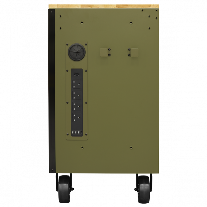 All heavy-duty steel construction and manufactured with steel inner walls for extra strength and durability. Power bar features 4 x 230V sockets, 3 x 5V (2.4A) USB sockets and 1 x 5V (3A) USB-C socket. Ten full height rear locking mechanism, soft close drawers with heavy-duty 45mm ball-bearing slides that provide superior performance. Each drawer features stylish black anodized drawer pulls plus pre-cut non-slip liners. Fitted with 18mm thick rubberwood worktop and four Ø125mm PP wheels with black chrome effect alloys, two castors with quick release anti-rotation toe locks and two fixed wheels. Side handle for added comfort when manoeuvring around the workplace. Power cord storage hanger. Supplied with two folding keys.