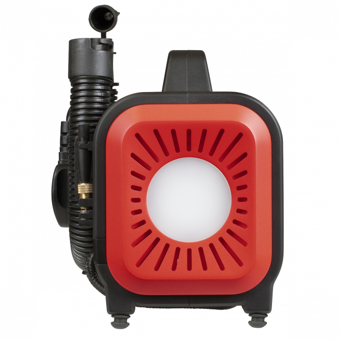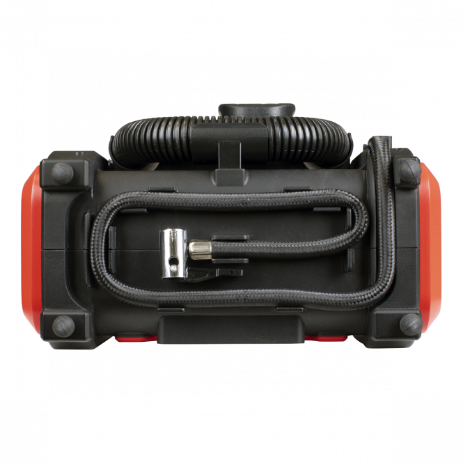 Suitable for inflating tyres on cars, vans, 4x4s, motorcycles and bicycles. High volume air pump with inflate/deflate function suitable for air mattresses and inflatables. Dual powered by 12V and 230V AC mains power. Maximum pressure 120psi. Air flow rate 22L/min with an inflation time of 0-35psi in 210sec (195/55R15). Pressure units psi, kPa, kg/cm² and bar. Auto-Shut-off safety feature when pre-set pressure is reached. Integrated SMD LED worklight with red SOS and flashing light function. Easy-to-read backlit LED digital display screen. Compact and lightweight unit with accessories fixed to the housing. Anti-vibration feet. Accessory kit includes Schrader connection, Presta type adaptor, ball spike and inflatable adaptor.