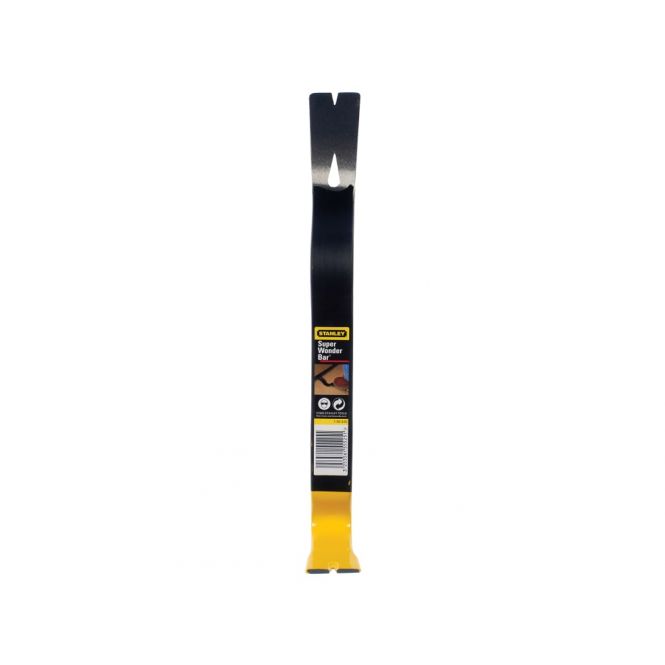 The Stanley Tools Super Wonder Bar® Pry Bar is made from forged, high-carbon steel for added strength and durability. Polished, bevelled cutting edges with a high-visibility, powder-coated finish. It has an arched centre for swing during nail pulling, no need for an additional wood block. The extended tongue provides added grip and access for hard-to-reach places. Tight radius on bend angle aids in positioning bar.